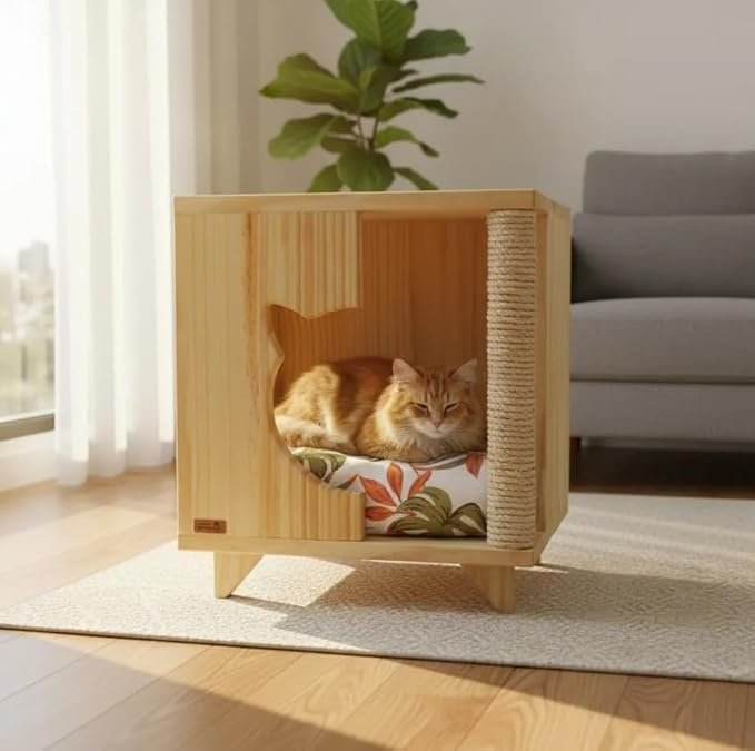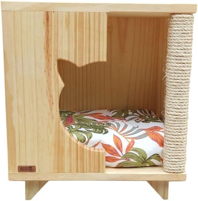 Produção artesanal com acabamento refinado – Arranhador integrado – funcional e protetor dos seus móveis – Almofada inclusa – mais conforto para o descanso do seu pet – Design que combina com a decoração da casa – Madeira natural com isolamento térmico – ideal em todas as estações – Fácil de limpar e super resistente