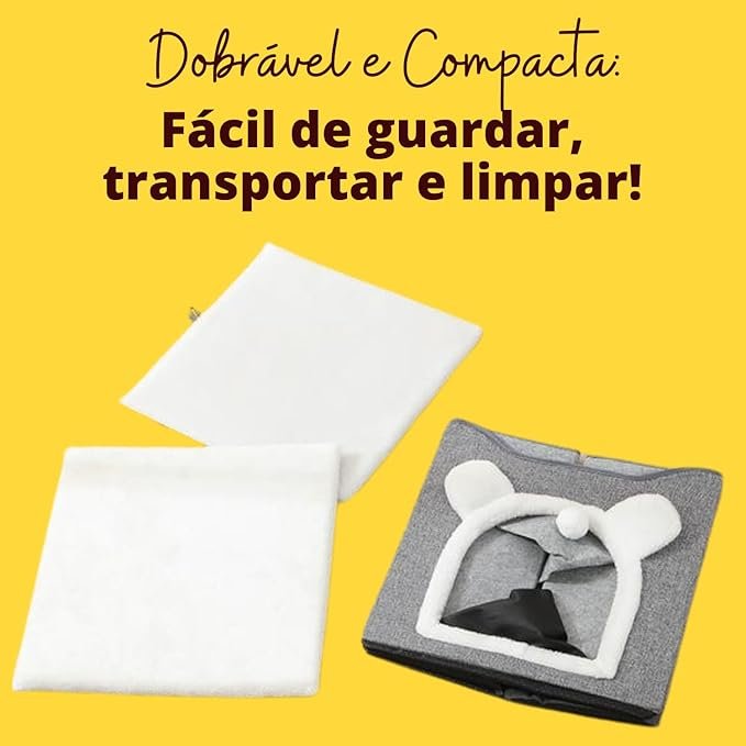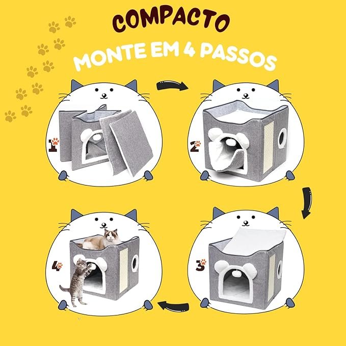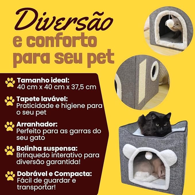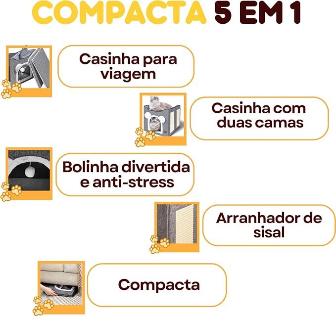- Casinha 5 em 1: cama, toca, túnel e arranhador, economizando espaço e dinheiro.