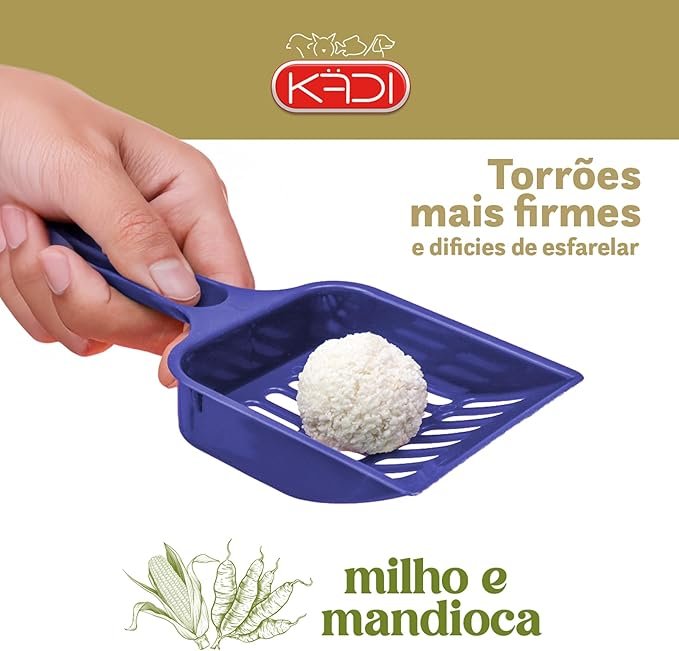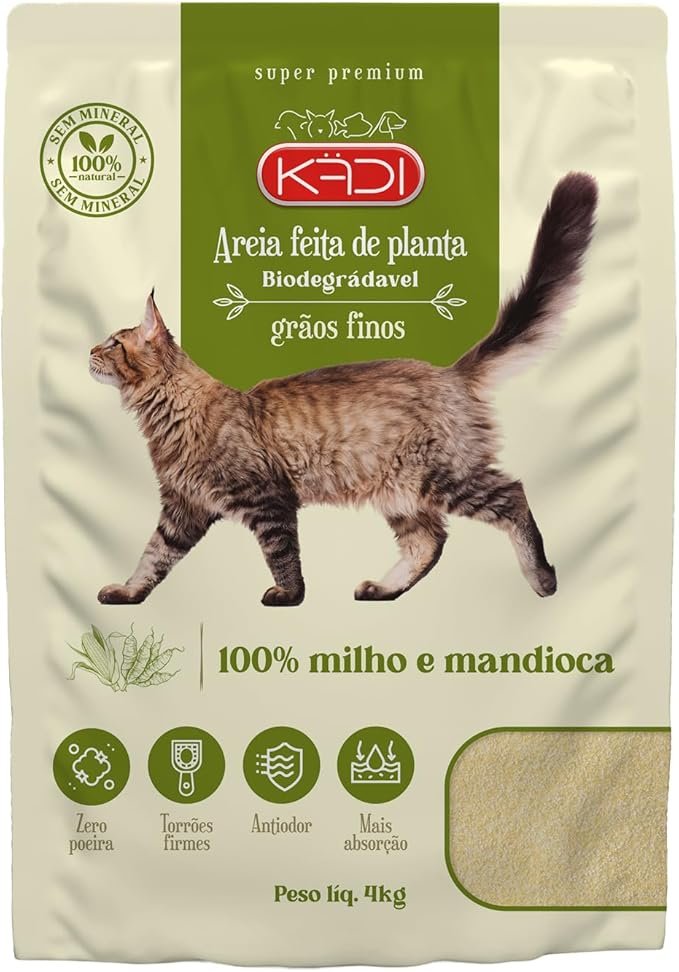 Feita com matéria-prima de origem natural, a areia KADI é feita 100% de milho e mandioca e livre de resíduos químicos 100% natural e biodegrádavel, sem resíduos químicos, degrada espontaneamente no meio do ambiente, absorvido em menor tempo pela natureza Torrões Firmes e instantâneos garantem mais facilidade na limpeza da caixa de areia e evitam que os grãos com urina se misturem com a areia limpa. Maior redução no odor de urina e fezes. Máxima absorção, rende mais e evita resíduos no fundo da caixa de areia. Sem poeira, ajuda contra problemas respiratórios dos gatinhos Cor clara ajuda a identificar possíveis alterações e tonalidade nas fezes e urina.